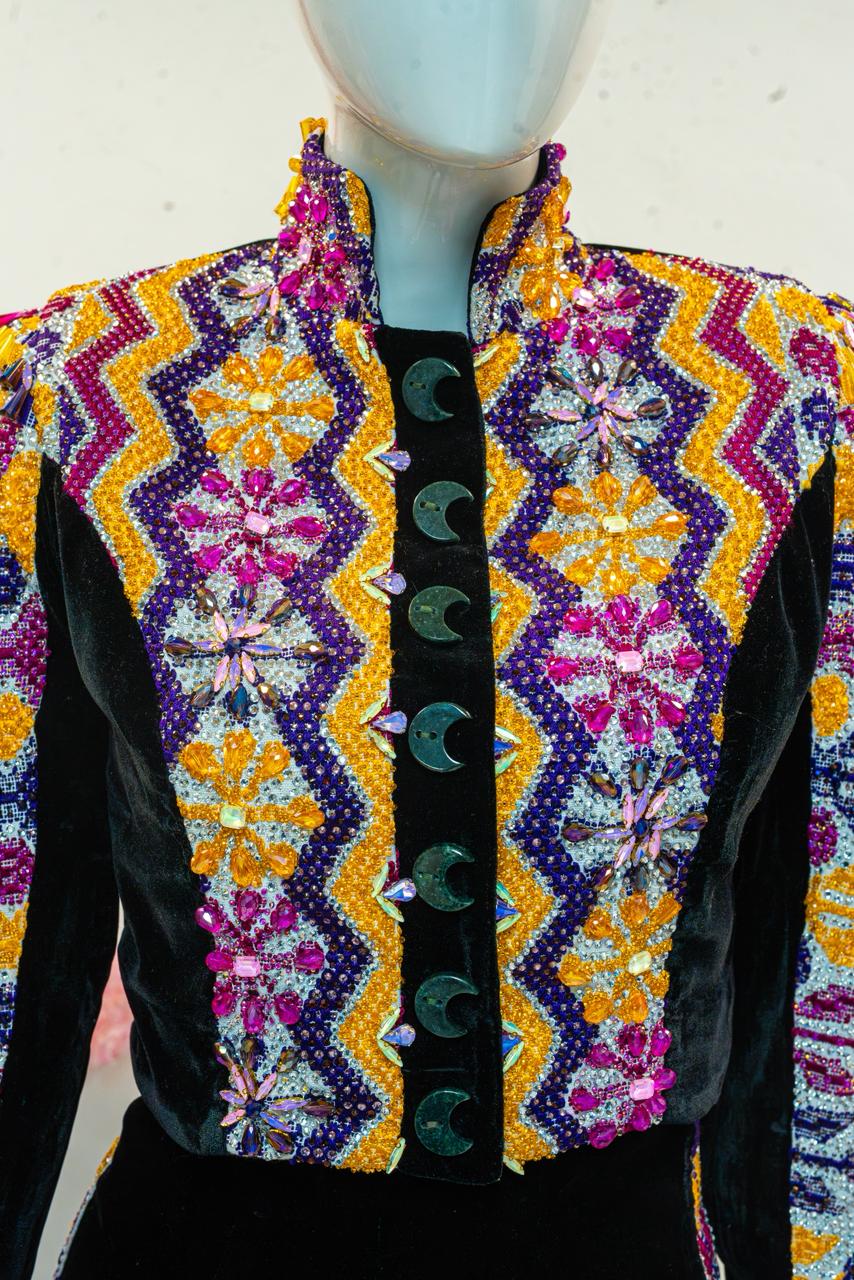 La chaqueta tipo torero, en terciopelo negro, representa la elegancia y fortaleza de la mujer quetzalteca. Está bordada con símbolos mayas auténticos y toques del traje ceremonial de Xela, decorado con cristales que reflejan la luz como si fueran estrellas.