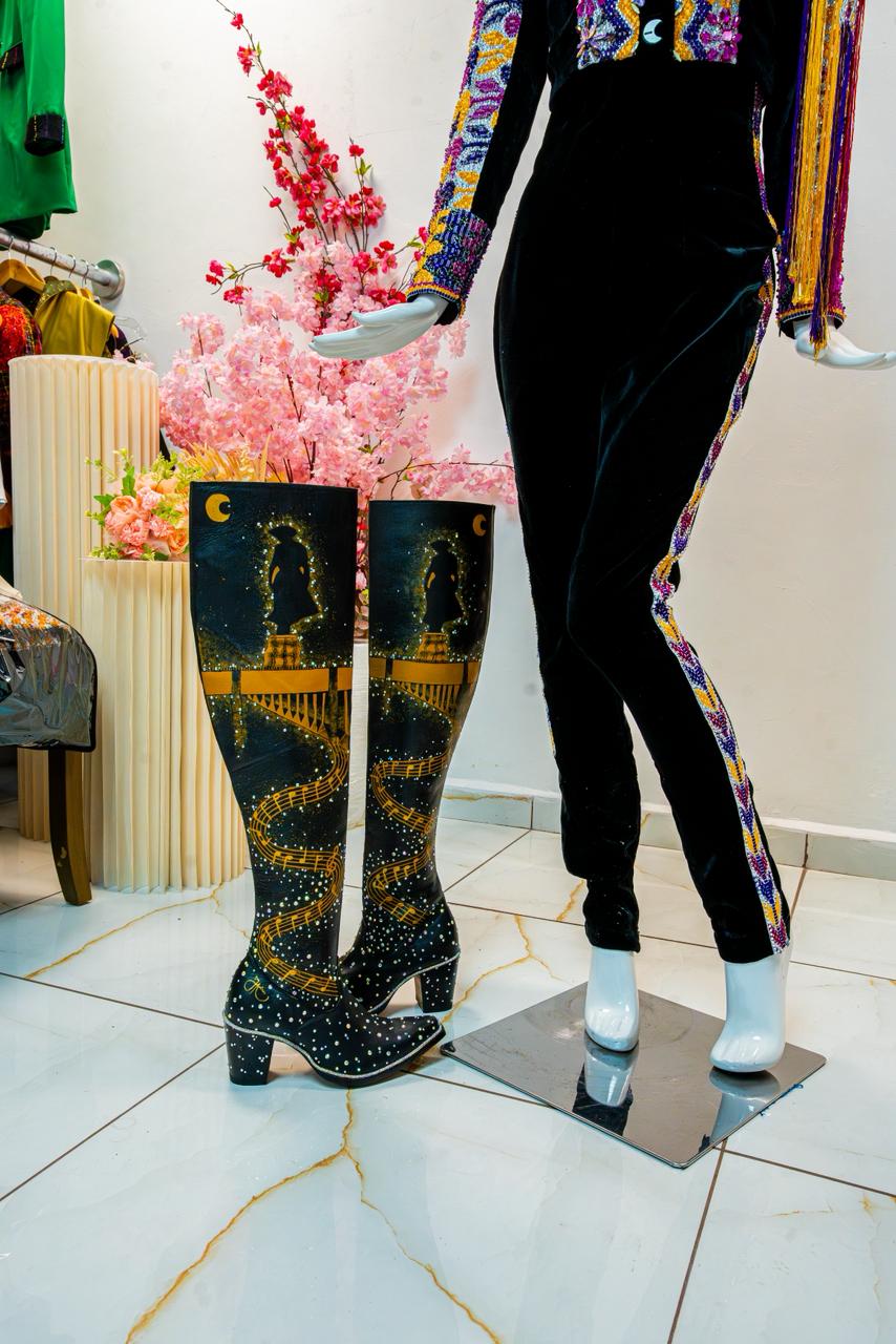 Las botas llevan plasmada la silueta del monumento a la marimba, obra del maestro quetzalteco Rodolfo Galeotti Torres. Lo acompañan, pintadas al óleo, las notas del emblemático himno de los quetzaltecos Luna de Xelajú. Esta creación fue elaborada por José Gómez y pintada por el artista quetzalteco José Jorge Asturias.