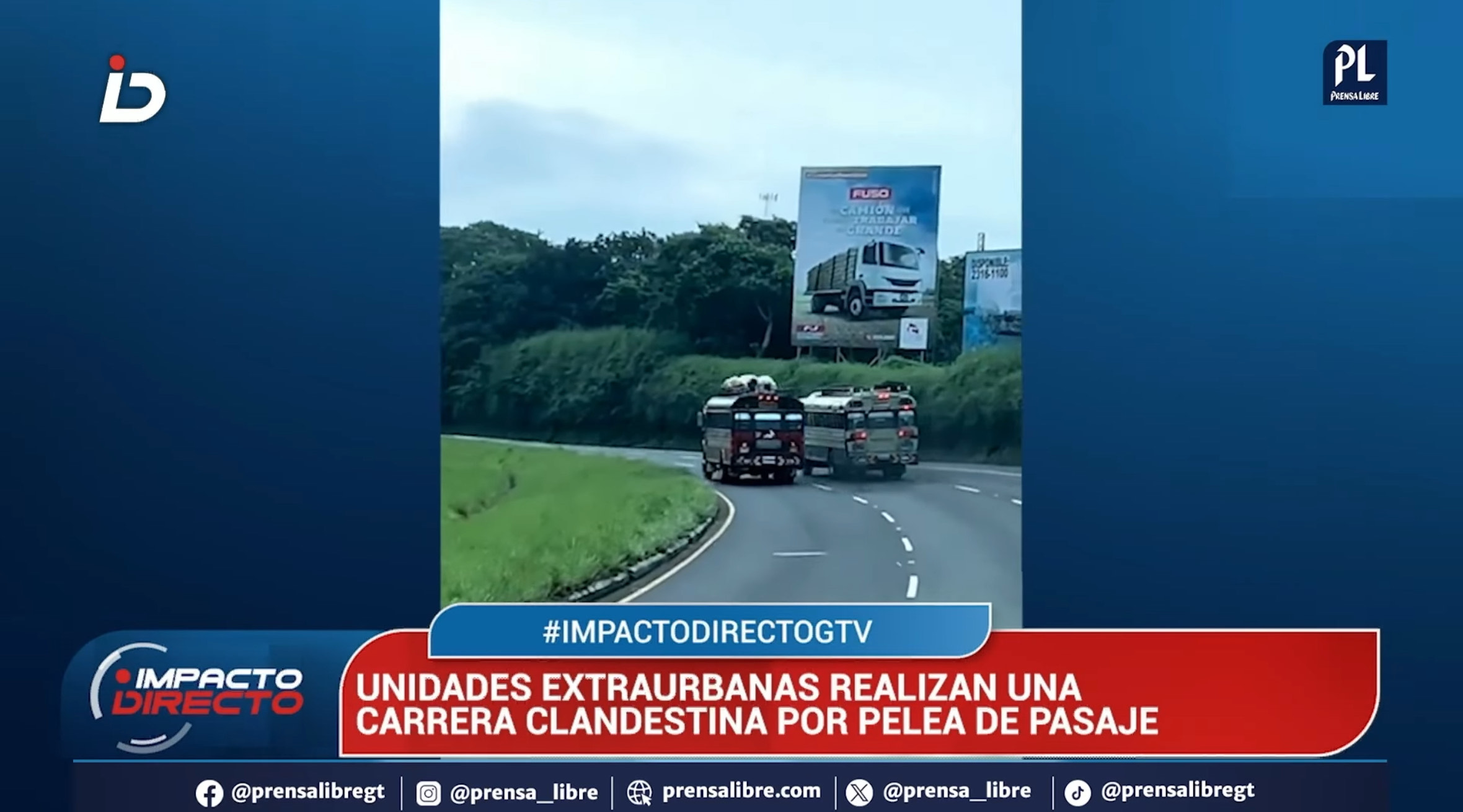 Las imágenes revelan cómo un bus de rutas Esmeralda y otro de rutas Tropicana compiten por captar pasajeros, llegando a casi chocar contra un camión que transitaba por el carril derecho. Tras evitar la colisión, continúan la peligrosa carrera, poniendo en riesgo la vida de quienes viajan y de otros usuarios de la carretera, un fenómeno que se ha vuelto habitual en distintas rutas del país.