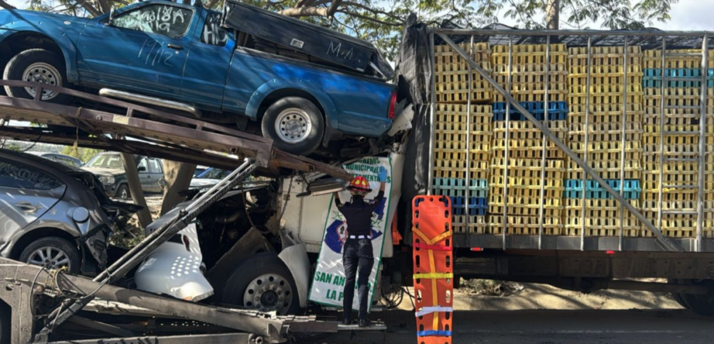 Elementos de Bomberos Municipales Departamentales de la estación de San Antonio La Paz, atendieron la emergencia y localizaron a la víctima en el interior de la cabina de uno de los vehículos involucrados.