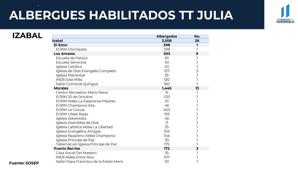 Según Conred, en total se registran 54 albergues en el territorio nacional. De este total, 26 se encuentran en Izabal, 20 en Alta Verapaz, 3 en Suchitepéquez, 2 en Huehuetenango, 2 en Quiché y 1 en Petén.