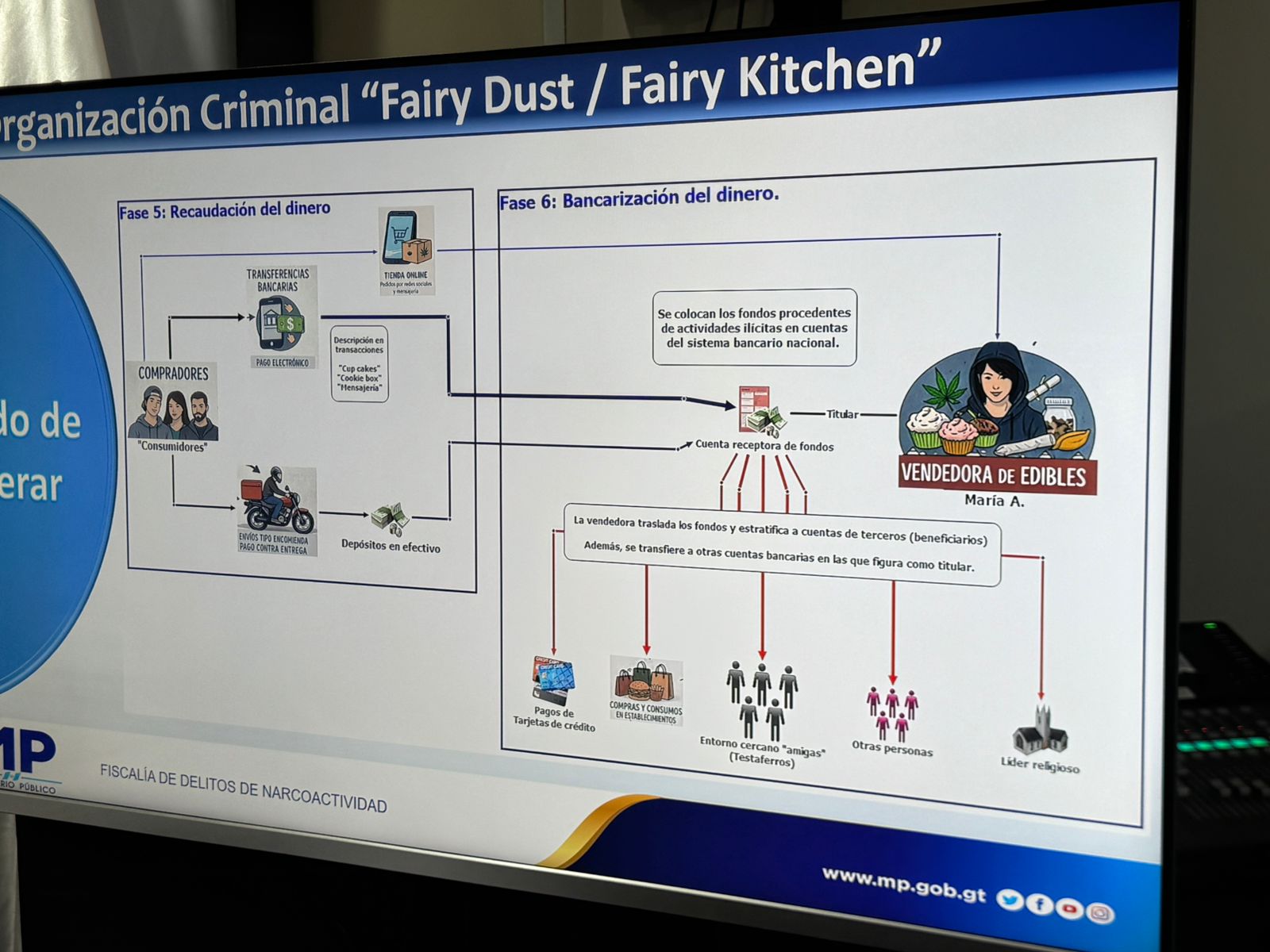 El 22 de marzo, la PNC reportó la detención de María, cabecilla de la estructura criminal denominada Fairy Dust o Fairy Kitchen. No es la primera integrante de su familia en ser detenida por la venta de narcopasteles, pues su hermano, quien era operador, fue uno de los siete capturados hace tres años en el país vecino.