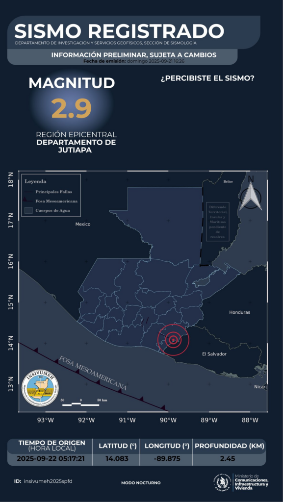 Además, se registró otro sismo aproximadamente una hora antes en el departamento de Jutiapa, alrededor de las 5:17 de la mañana, con una magnitud leve de 2.9 grados, percibiéndose en las regiones de Cuilapa y Jalapa.