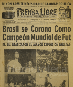 Un día después de la final, Prensa Libre dedicó su titular principal al logro escribiendo “Brasil se corona como campeón mundial de fut”. En el interior, agregan que Vava y Pelé fueron los mejores jugadores de la final.