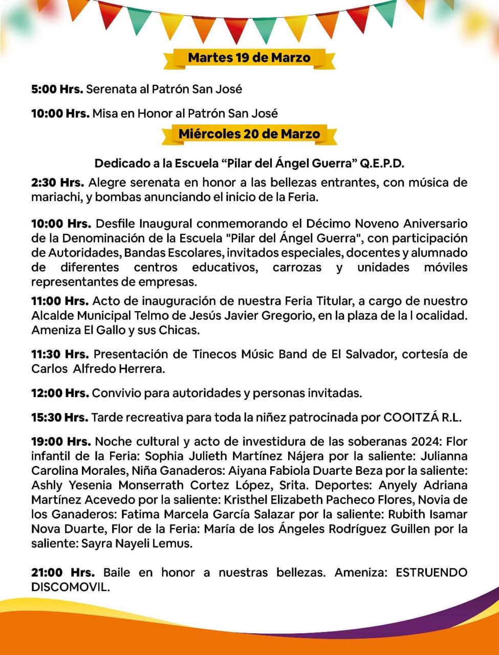 Chiquimula, 20 mar. (AGN). – En el marco de la feria patronal en honor a San José, han iniciado las actividades religiosas, culturales, deportivas, ganaderas en La Ermita, Concepción Las Minas, Chiquimula. Este miércoles 20 de marzo se tiene contemplando la serenata en honor a las bellezas entrantes. A las 10:00 horas, desfile inaugural con […]