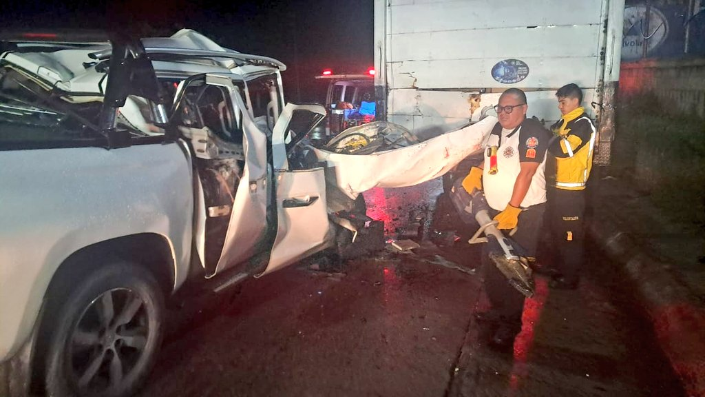 Bomberos Voluntarios atendieron la emergencia y brindaron asistencia al piloto del pickup, quien resultó herido tras impactar en la parte trasera del camión.