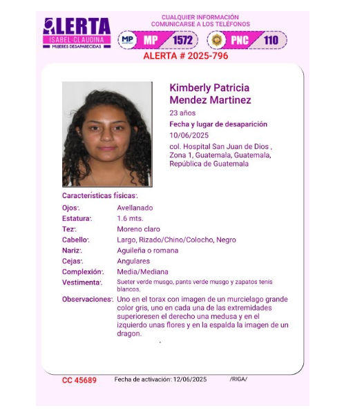 El MP informó que la Fiscalía de la Mujer, a través de su Unidad de Mujeres Desaparecidas, da seguimiento a una alerta Isabel-Claudina activada este jueves 12 de junio en la madrugada.