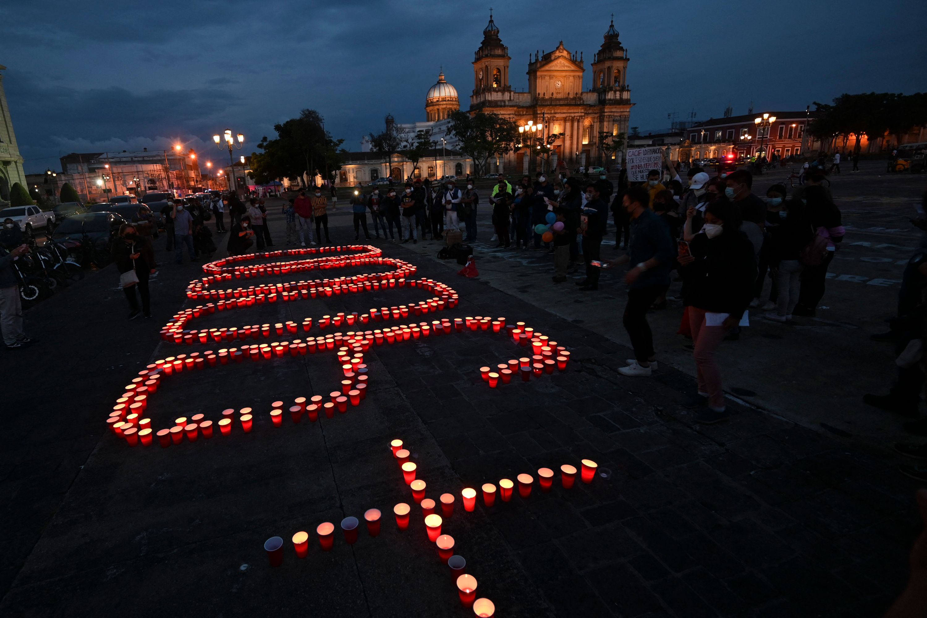 Decenas de guatemaltecos encendieron velas la noche de este sábado 26 de junio en el centro de la capital para recordar a los más de nueve mil muertos que ha dejado el covid-19 en el país y señalaron de mal manejo de la pandemia al presidente, Alejandro Giammattei.