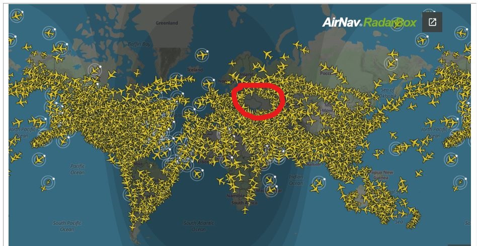 El espacio aéreo de Ucrania fue cerrado luego de la escalada del conflicto con Rusia y al revisarlo en tiempo real luce de esta manera.