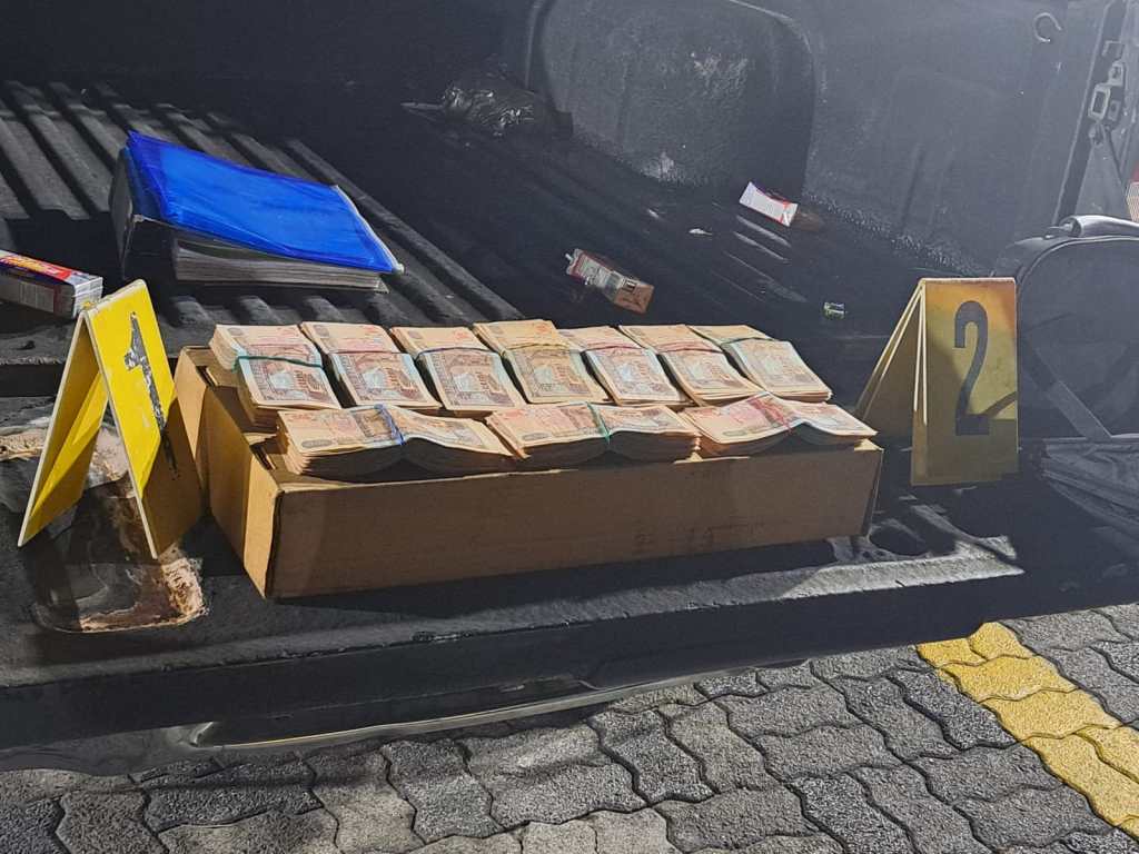 “En el referido lugar las personas fueron sorprendidas con un maletín, el cual, al realizar la revisión correspondiente, contenía dinero en efectivo, por lo que con el apoyo de los técnicos en investigaciones criminalísticas realizan el conteo respectivo y suman Q95 mil”, explica.