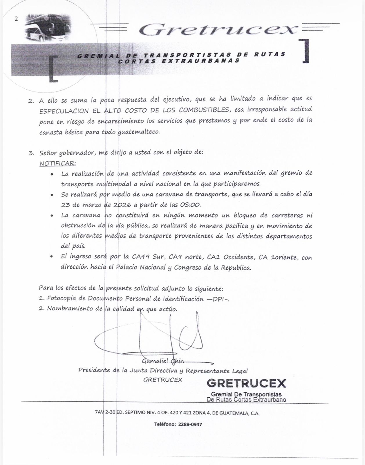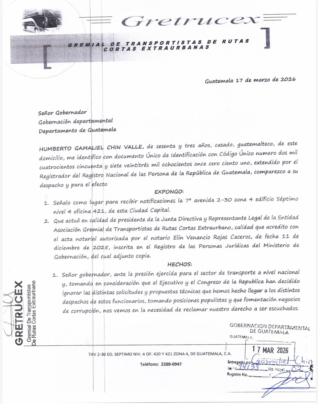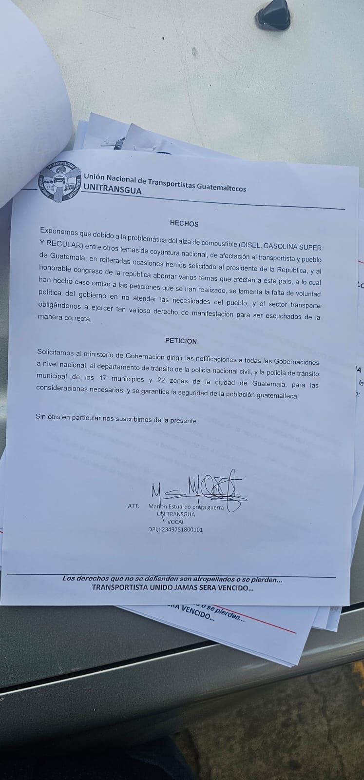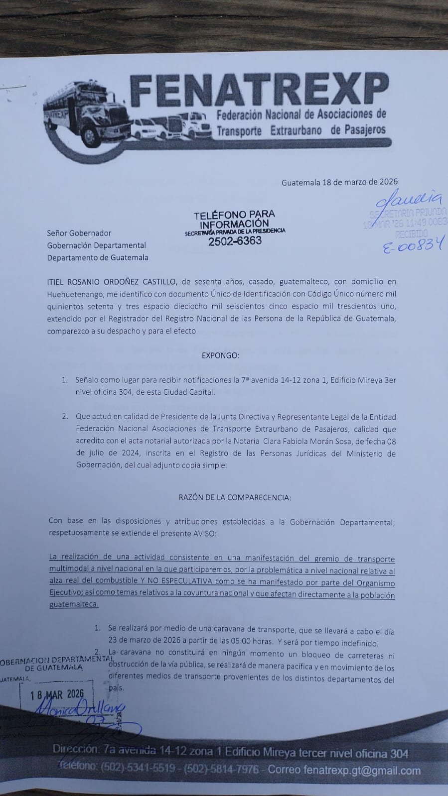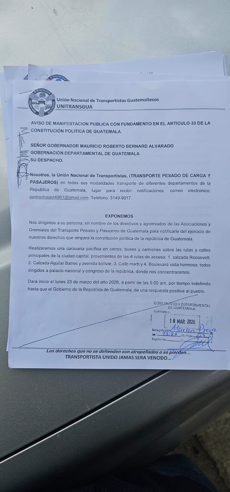 El anuncio fue realizado por la Unión Nacional de Transportistas (Unitransgua), la Federación Nacional de Asociaciones de Transporte Extraurbano de Pasajeros (Fenatrexp) y la Gremial de Transportistas de Rutas Cortas Extraurbanas (Gretrucex), mediante avisos dirigidos al gobernador departamental de Guatemala, Mauricio Bernard.
