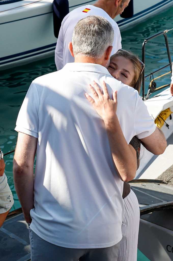 La princesa Leonor saludó también a otra de las tripulaciones de los veleros de la Armada que compiten en aguas de la bahía de Palma, situado en el pantalán junto al ‘Aifos’, antes de despedir a su padre con un beso antes de que se embarcara para participar en la última prueba de la copa de vela que afronta en sexta posición.