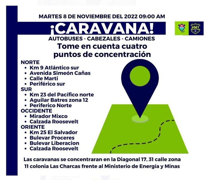La caravana de occidente saldrá de El Mirador de Mixco, km 25 de la ruta Interamericana, luego circulará por la calzada Roosevelt y luego subirá al Periférico, hacia el sur.