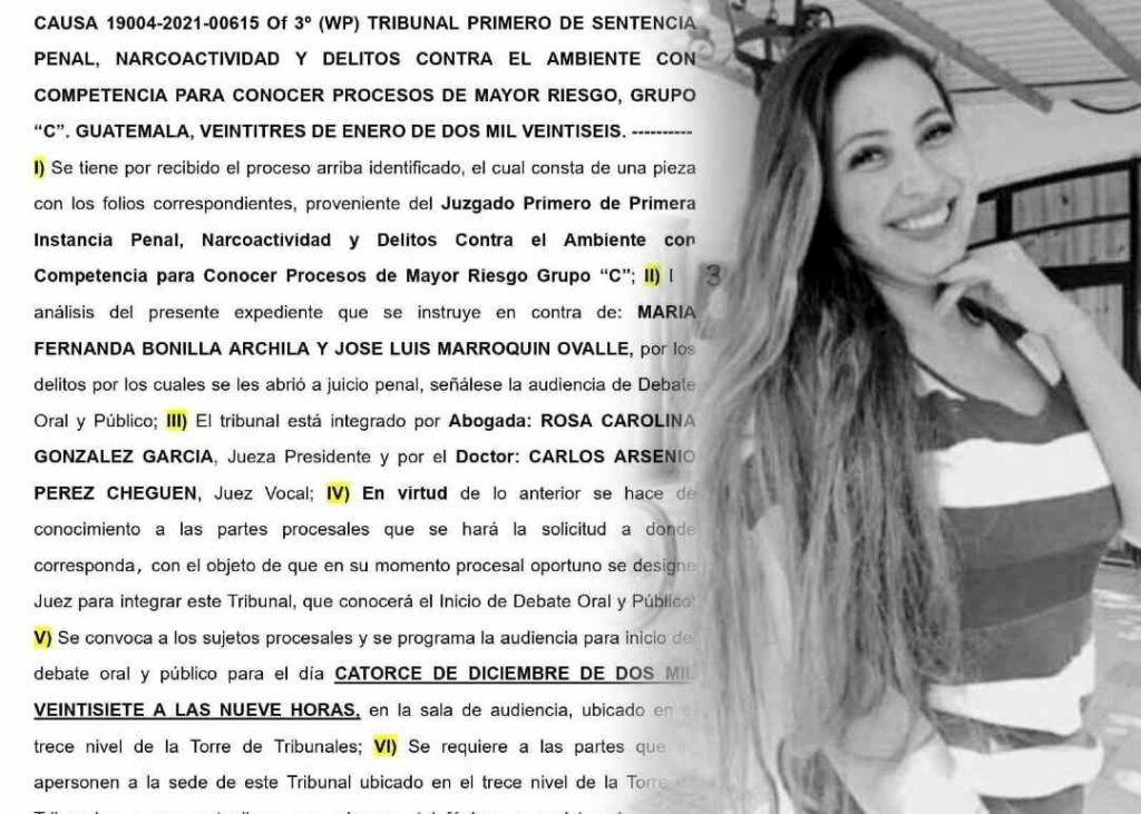 Según la resolución judicial, el debate oral y público en contra de María Fernanda Bonilla y José Luis Marroquín fue programado para el 14 de diciembre de 2027, con inicio a las 9:00 horas.