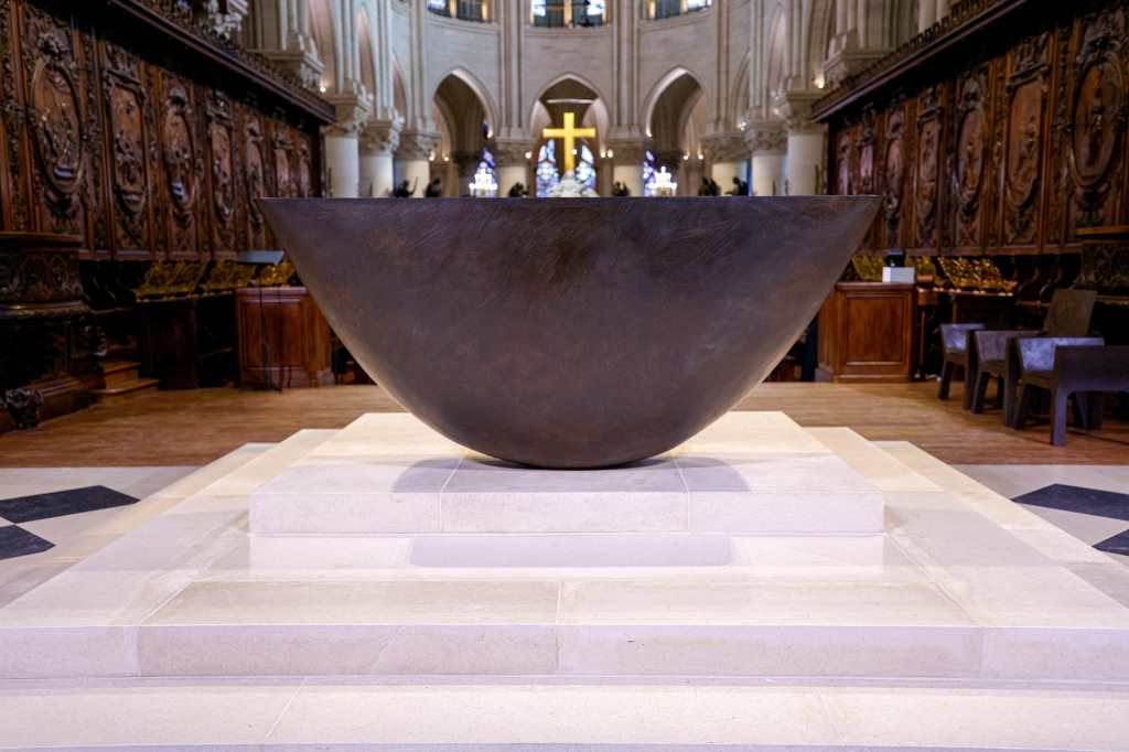Dentro, los invitados pudieron descubrir todo el mobiliario diseñado expresamente para esta nueva etapa del monumento, como las sillas, o el moderno baptisterio en la entrada de la nave, diseñado por el artista Guillaume Bardet.