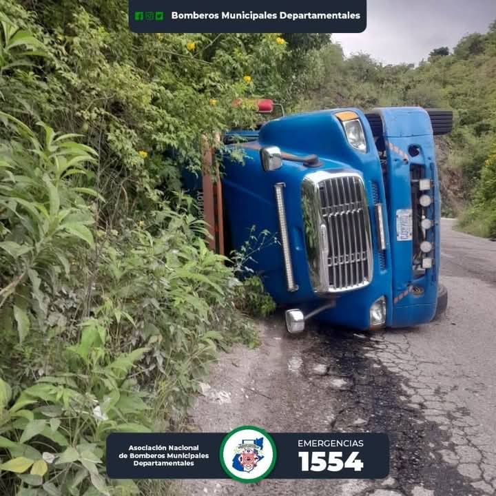 Un vehículo de transporte pesado volcó sobre la vía pública en el kilómetro 64 de la ruta a Sansare, El Progreso, por causas que aún no han sido establecidas. El percance provocó la movilización de los Bomberos Municipales Departamentales de la zona.