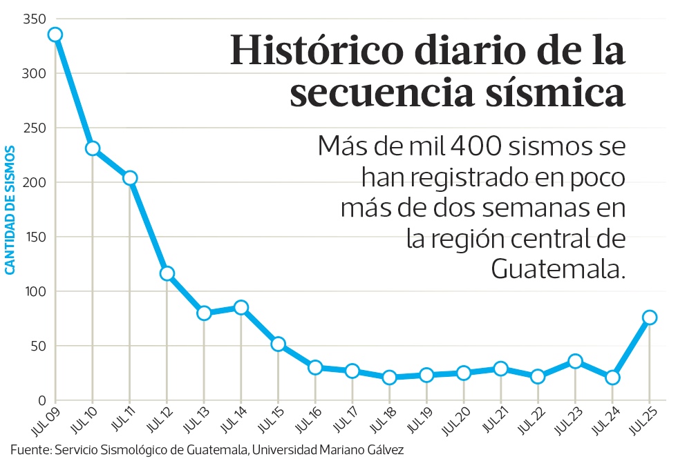 Según el reporte, hasta las 18 horas del 25 de julio, la región central —que abarca Escuintla, Sacatepéquez y Guatemala— había sido sacudida por esa cantidad de movimientos telúricos, consecuencia de una secuencia sísmica iniciada a las 15.11 horas del 8 de julio. El evento principal fue un sismo de magnitud 5.6, ocurrido a las 15.41 horas.