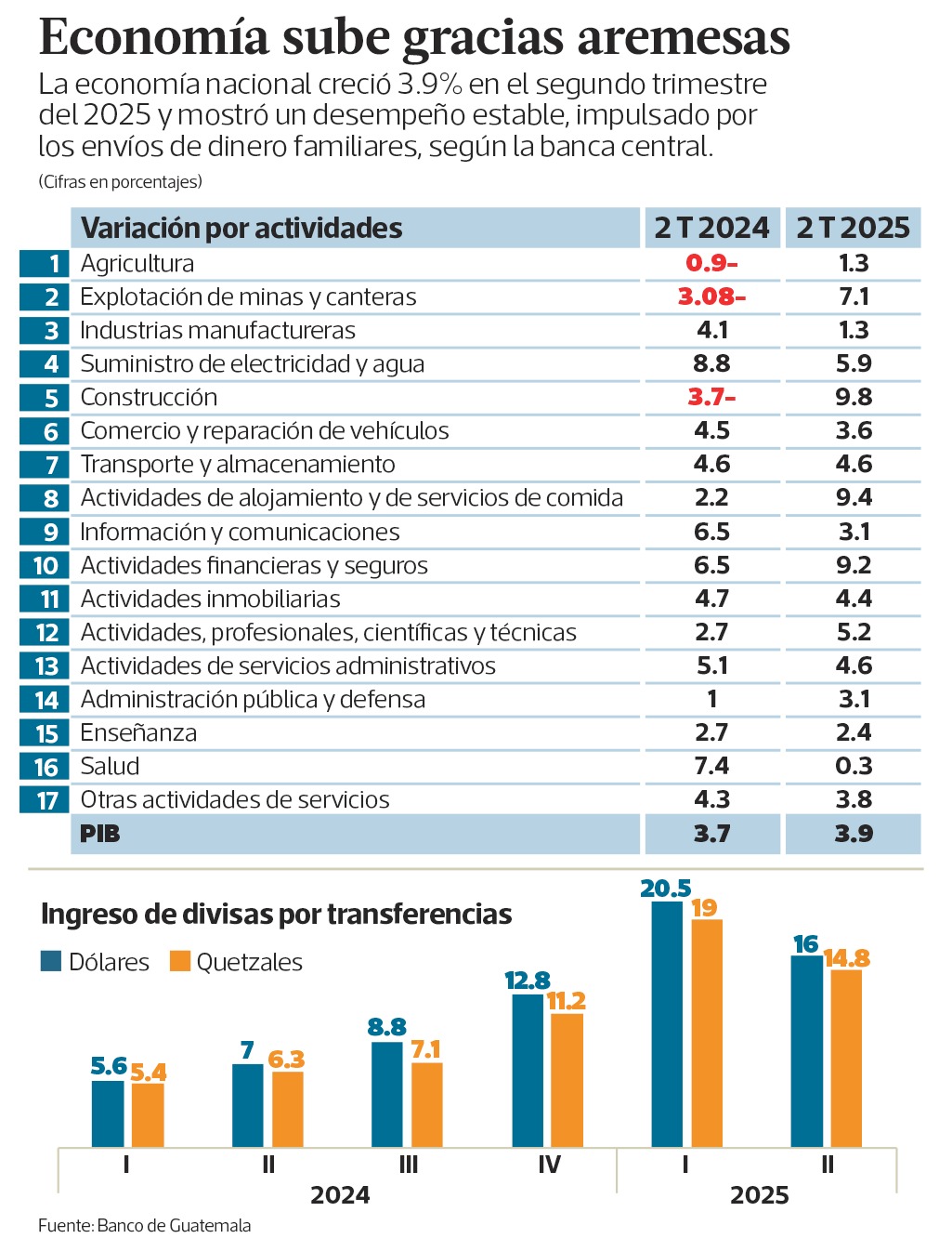La recepción de remesas sigue siendo un pilar de la economía guatemalteca por medio del consumo privado. En el segundo trimestre del año, este ingreso fue un indicador que dinamizó la producción nacional y generó un efecto multiplicador en diversas actividades sectoriales.