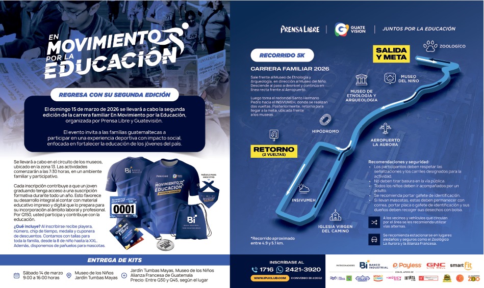 El domingo 15 de marzo del 2026, Prensa Libre y Guatevisión realizarán la segunda edición de la carrera familiar “En Movimiento por la Educación”, un evento deportivo con causa que busca fortalecer la formación académica de miles de jóvenes en todo el país.