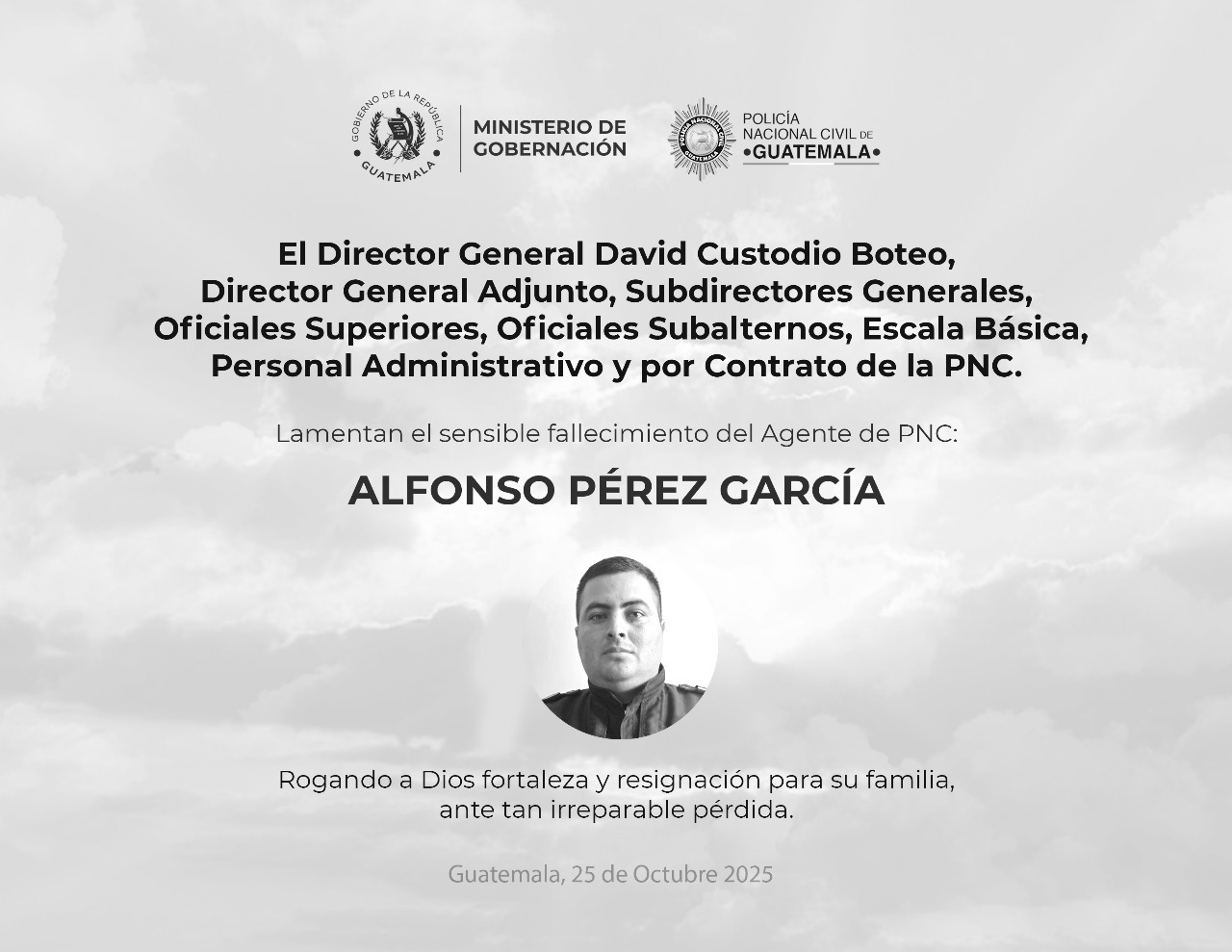 La noche del sábado 25 de octubre, Alfonso Pérez García, agente de la Policía Nacional Civil (PNC),realizaba su rutina de patrullaje con normalidad cuando un accidente le arrebató la vida: un árbol le cayó encima.