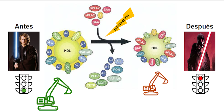 El HDL se ve igualmente influido por la inflamación y retira menos colesterol, perdiendo su función protectora. O sea, la inflamación lo hace más perezoso.
