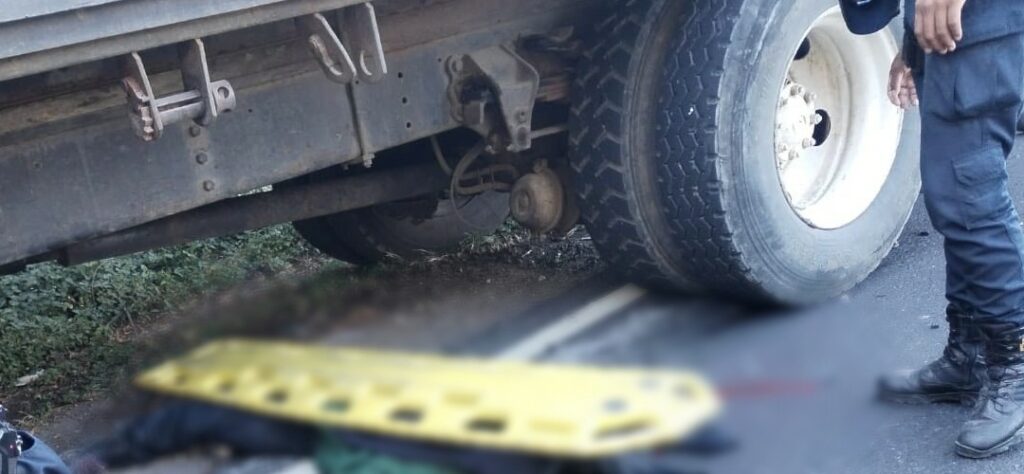 En el lugar, una motocicleta derrapó y quedó bajo las llantas de un camión. El conductor del camión intentó esquivarlos, pero los motoristas quedaron atrapados en la llanta trasera.