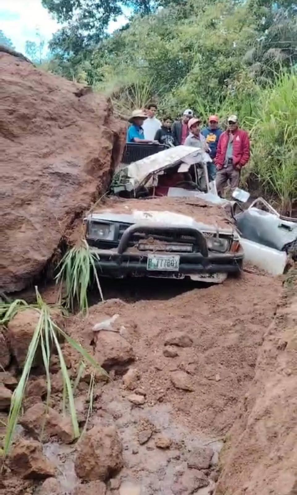 Un vehículo se vio afectado por un derrumbe de grandes proporciones que cayó sobre un camino rural en Santa Rosa, específicamente en la ruta hacia el puente Quebrado, que conecta el municipio de San Rafael Las Flores con la aldea Chan Grande. Afortunadamente, no se reportaron heridos de gravedad.