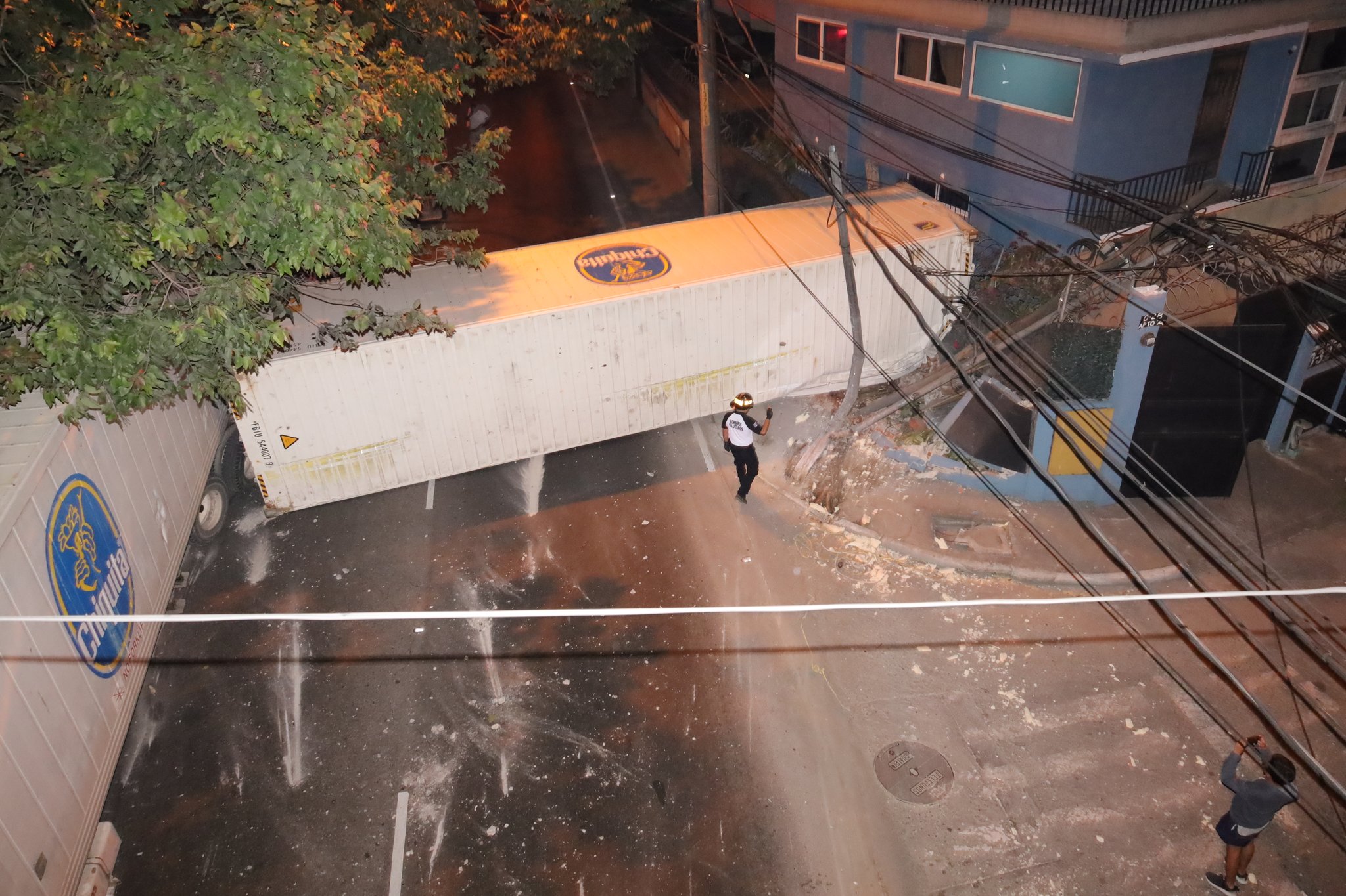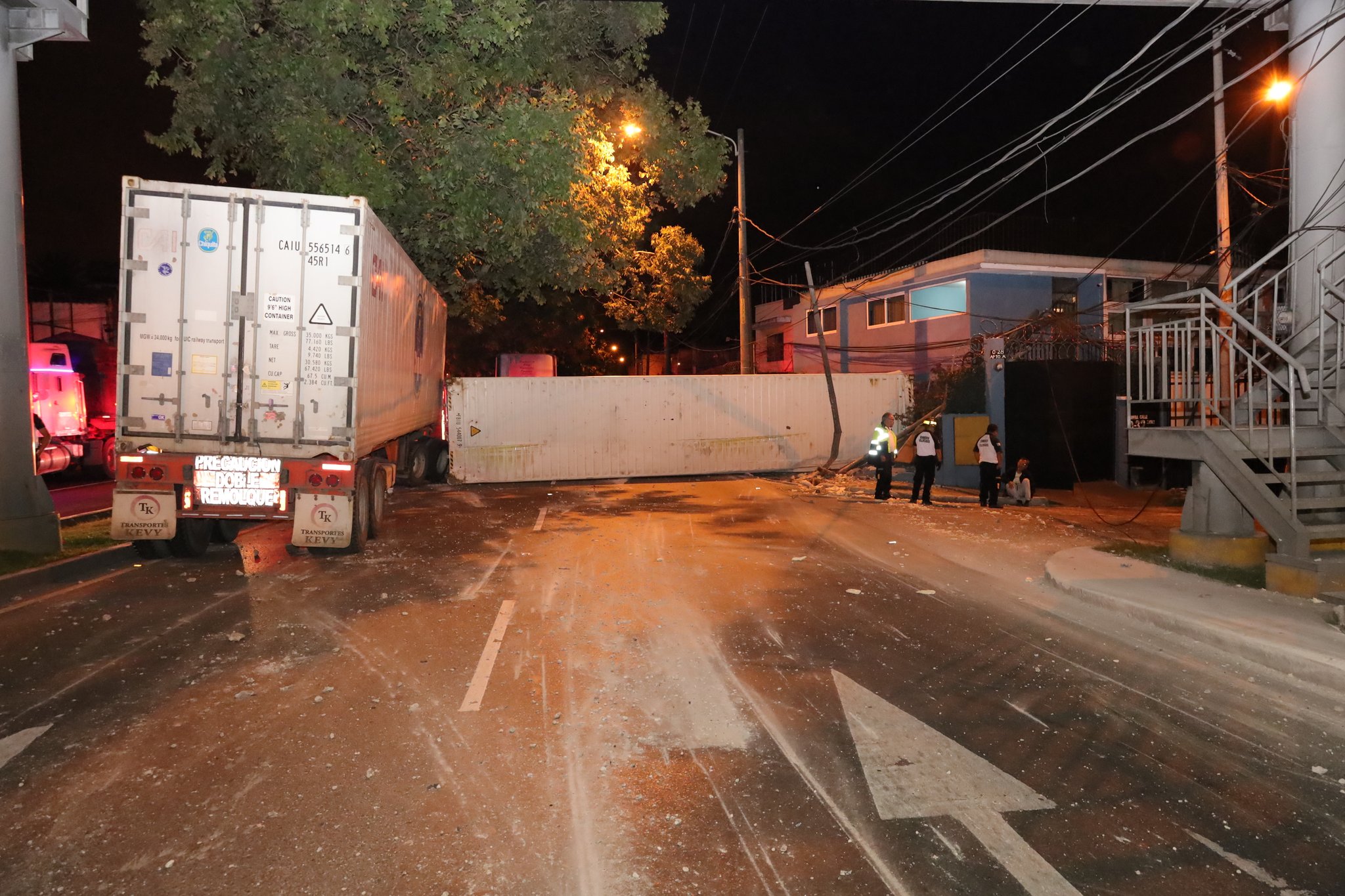 Un contenedor se desprendió y fue a impactar a una vivienda en dicho lugar. Solo se reportan daños materiales a una vivienda y un vehículo.