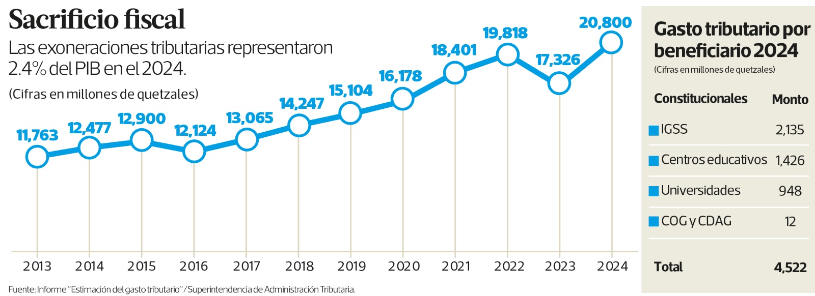 El gasto tributario en Guatemala fue de Q20 mil 800 millones durante el 2024 y superó los Q17 mil 326 millones contabilizados en el 2023, según un reporte del administrador tributario.