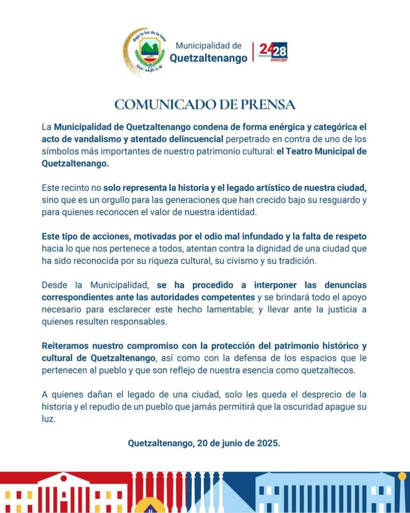 La Municipalidad de Quetzaltenango emitió este 20 de junio un comunicado en donde denuncia supuestos actos vandálicos hechos en el Teatro Municipal.