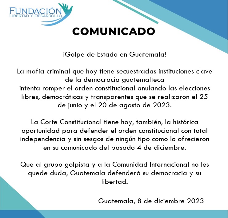 En un comunicado, la Fundación Libertad y Desarrollo ha denunciado un “Golpe de Estado en Guatemala”, señalando que “la mafia criminal que hoy tiene secuestradas instituciones clave de la democracia guatemalteca intenta romper el orden constitucional anulando las elecciones libres, democráticas y transparentes que se realizaron el 25 de junio y el 20 de agosto de 2023.”