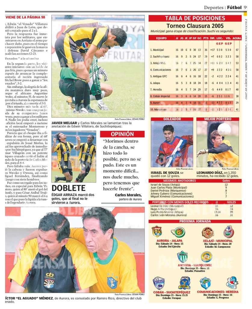 El domingo 8 de mayo de 2005, Aurora, el tercer equipo más ganador de Guatemala, llegó condicionado al estadio Carlos Salazar Hijo, de Mazatenango, donde enfrentaría a Suchitepéquez.