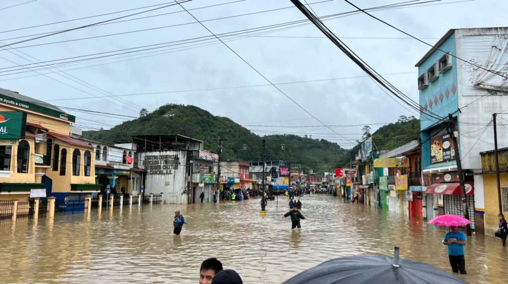 Una de las inundaciones se registra en el kilómetro 240 de la ruta a Morales, Izabal, donde algunas personas han decidido caminar entre el agua para tratar de llegar a su destino.
