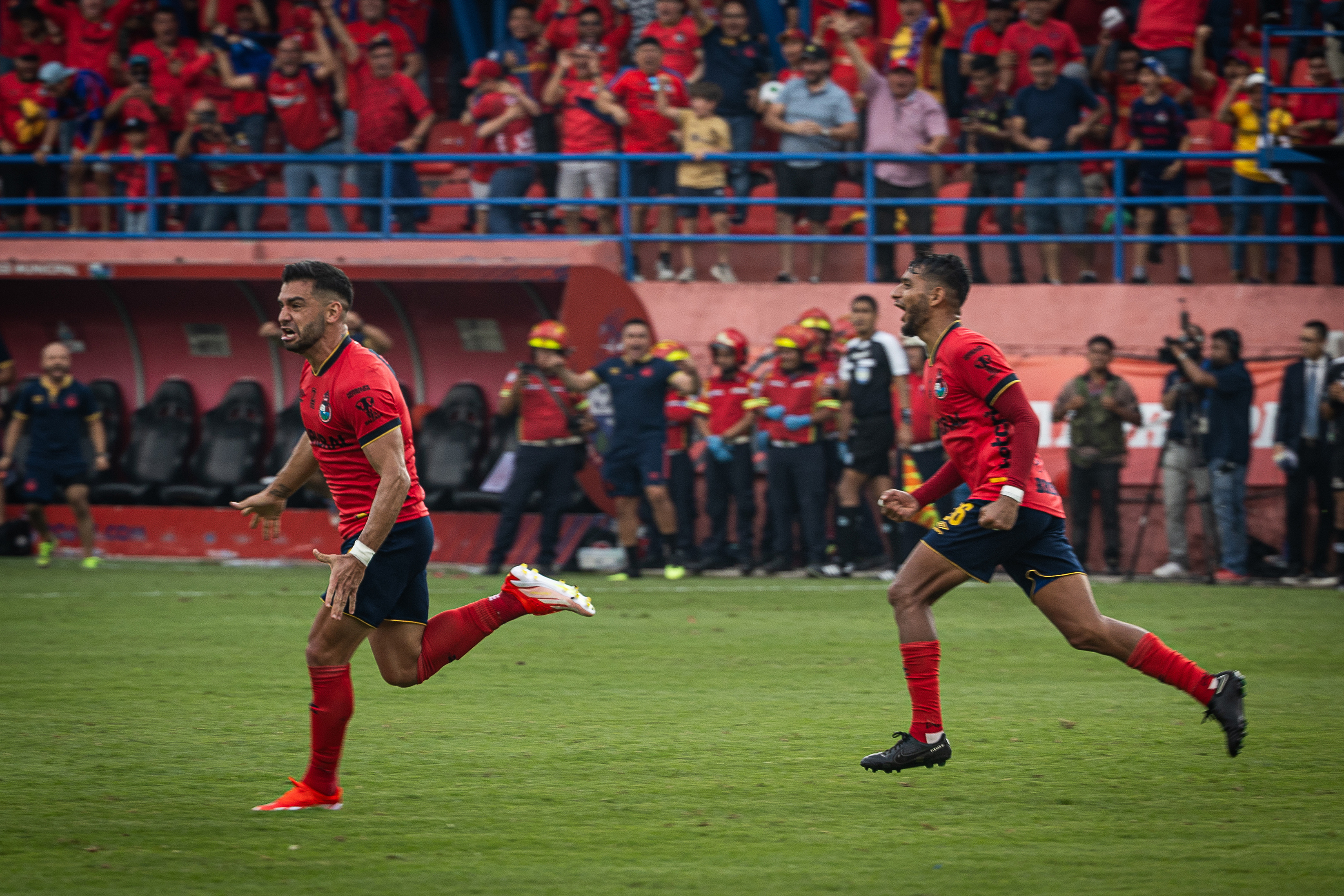 El argentino Matías Rotondi celebra junto al volante Rudy Barrientos la anotación que le dio su titulo 32 al Municipal. (Foto Prensa Libre: EFE)