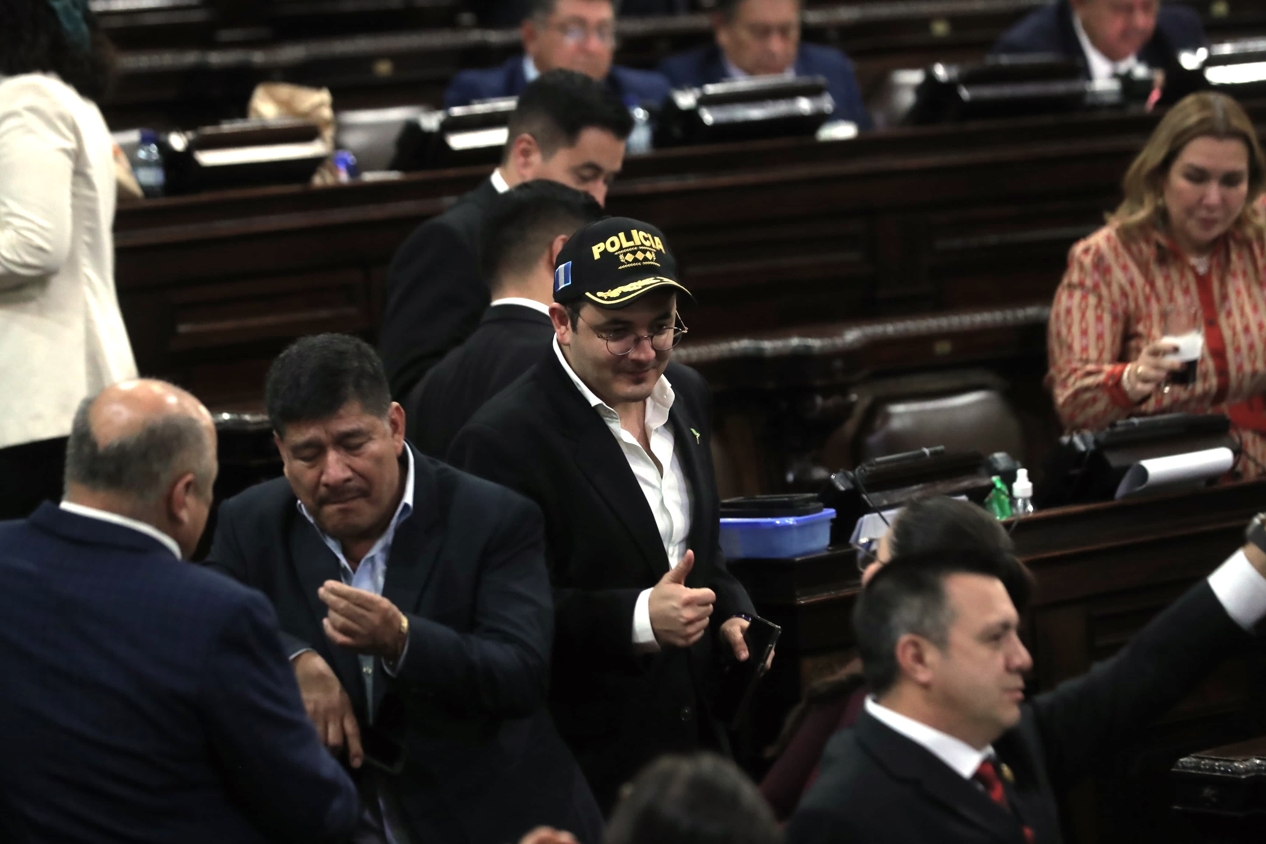 El diputado Samuel Pérez usa una gorra de la PNC durante la aprobación de las reformas y la nueva Ley de la Policía Nacional Civil en el Congreso. (Foto Prensa Libre: Óscar Vásquez)